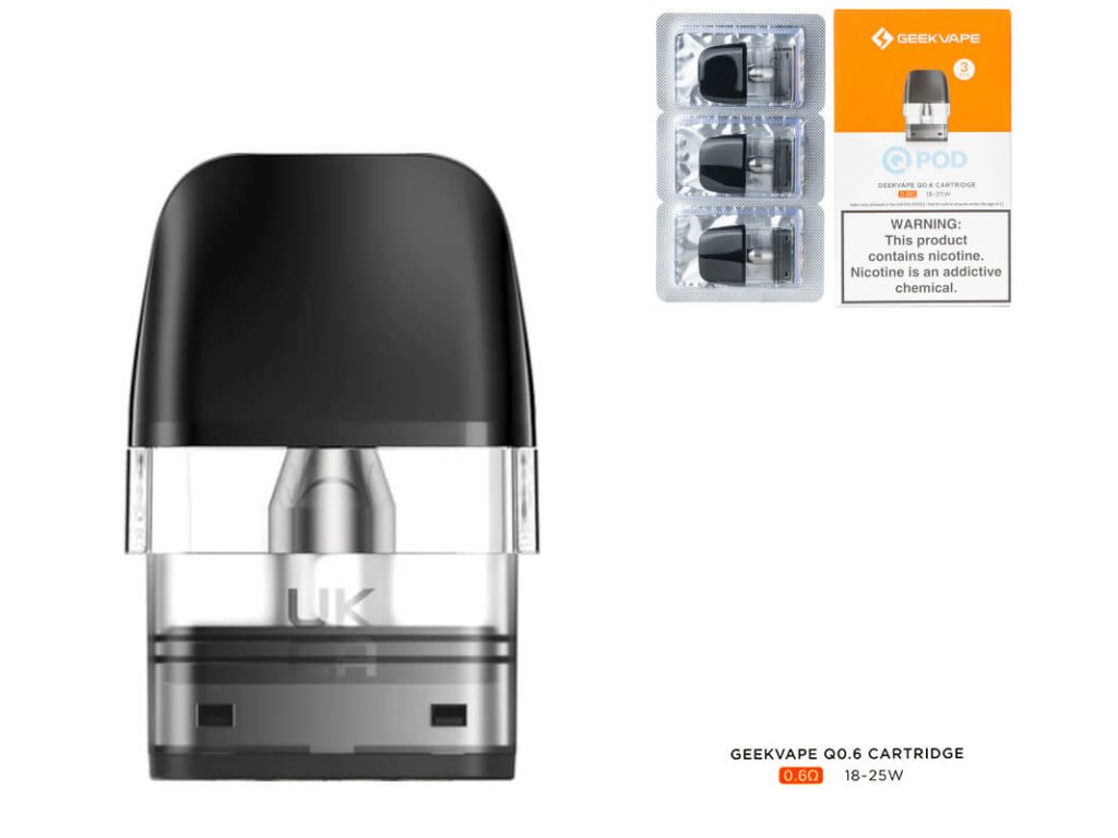 GEEKVAPE Q POD CARTRIDGE s objemom 2ml, určený pre štýl vapovania MTL a to pre elektronické cigarety Geekvape, využívajúce tento pod, napríklad WENAX Q, SONDER Q. Vstavané žeraviace hlavy majú odpor 0,6Ω, 0,8Ω alebo 1,2Ω a keďže sú v kazete pevne zabudované, nie sú vymeniteľné.